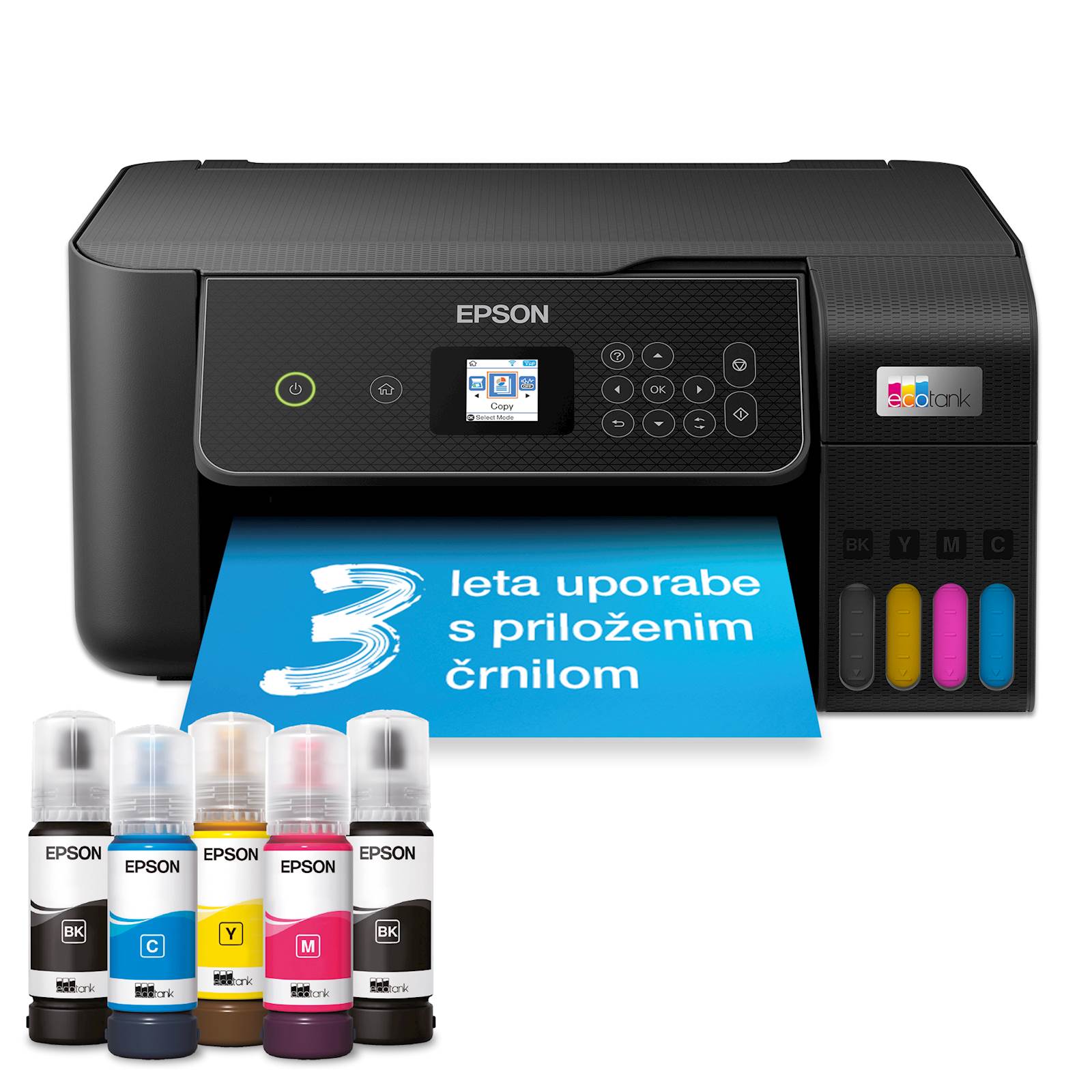 Priložena črnila Bk za 8.100 strani in CMY za 6.500 strani , 2x črna + CMY (stekleničke serije 103)